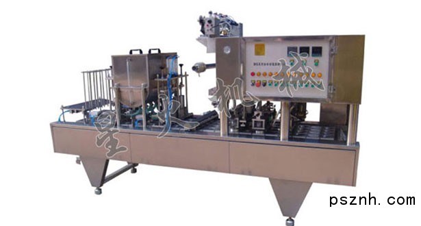 猪皮冻灌装封口机适用于各种猪皮冻、八宝粥、绿豆沙等产品的生产,能自动完成塑料碗/杯的自动落碗/杯、充填米、充填莲子等、水灌装、紫外线消菌、光电定位、两道热封、自动对芯剪切及废膜回收等功能。